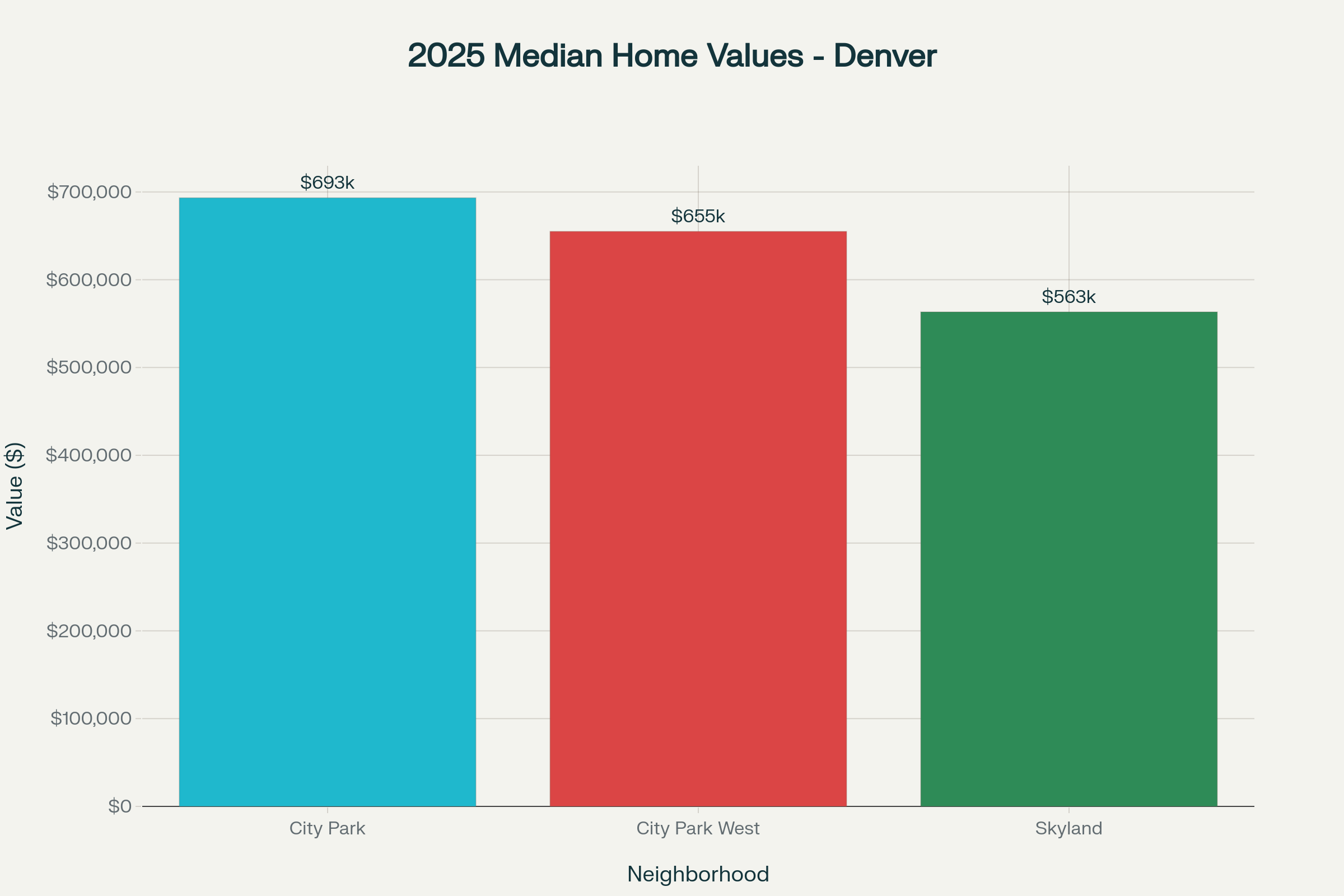 A bar chart illustrates the 2025 median home values for City Park, City Park West, and Skyland.