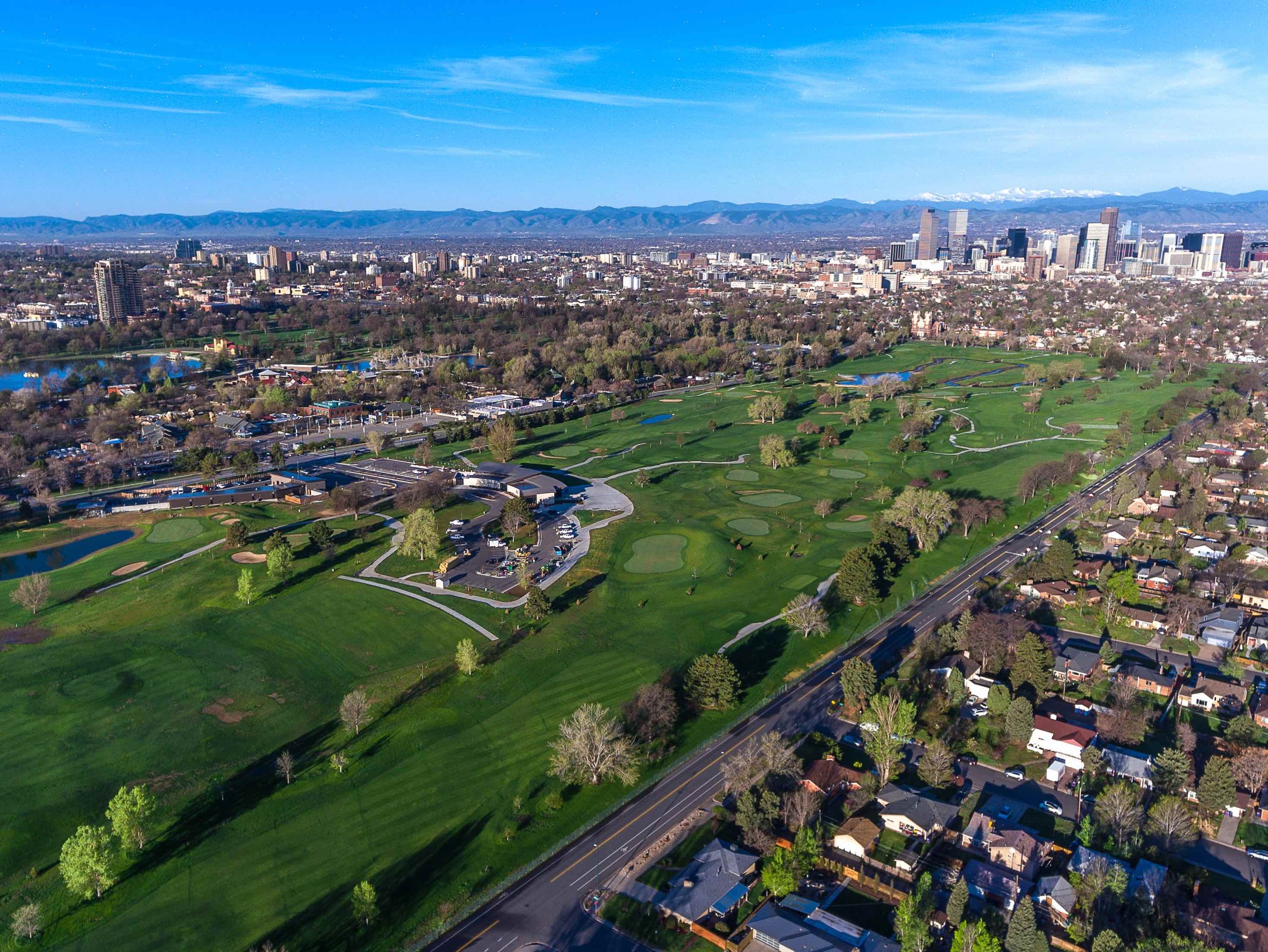 An aerial view of City Park underscores its proximity to downtown Denver, sprawling green spaces, and the residential streetsfacing the park.